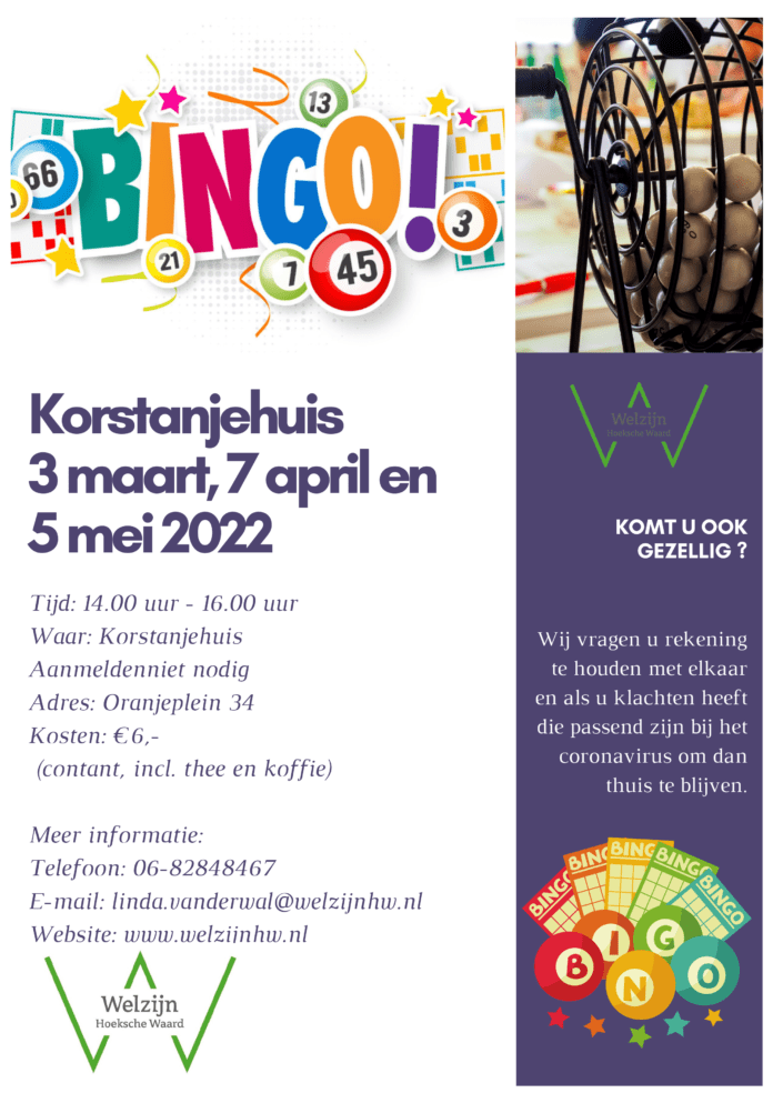 De Bingo vindt plaats tussen 14.00 uur en 16.00 uur en de kosten zijn €6,50 inclusief koffie/thee. Vooraf aanmelden is niet nodig. Voor meer informatie over de activiteiten van Welzijn Hoeksche Waard in het Korstanjehuis kunt u bellen of mailen met Linda van der Wal, 06-82848467, [email protected]