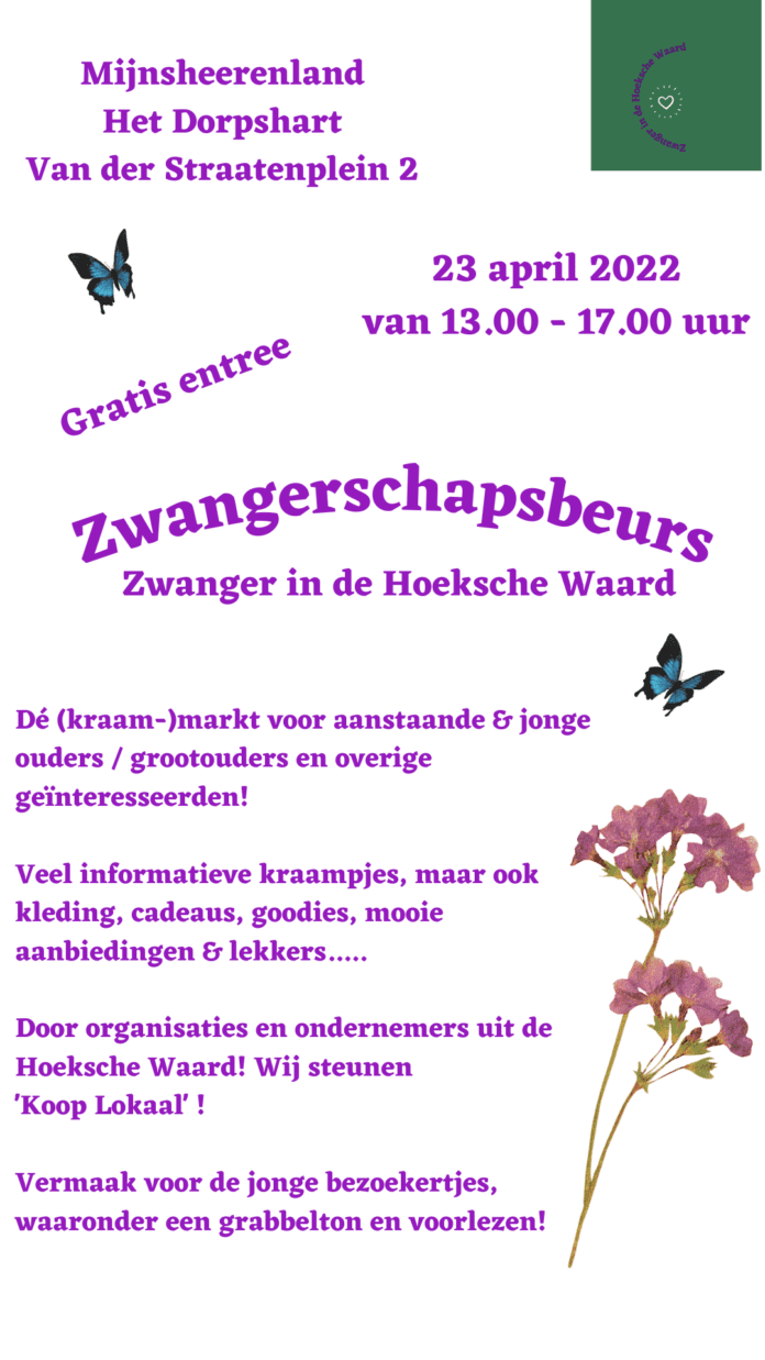 In het centraal gelegen Dorpshart in Mijnsheerenland staan zaterdag 23 april tussen 13.00 – 17.00 uur veel enthousiaste ondernemers klaar voor iedereen die geïnteresseerd in alles wat te maken heeft met zwangerschap, bevallen, ouderschap en jonge kinderen. Van kinderopvang en kraamzorg tot zwangerschapscursus en geboortefotografie en van baby-artikelen tot gezondheid & welzijn voor het hele gezin.