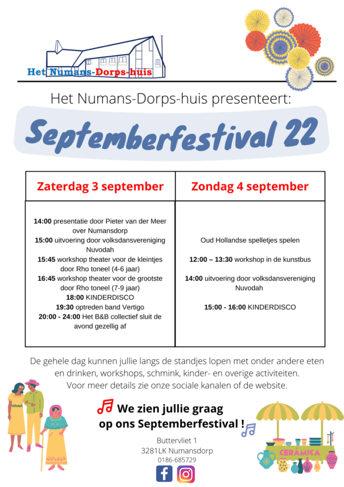 Numansdorp – Met gepaste trots kunnen we melden dat Het Numans-Dorps-huis het culturele seizoen gaat openen met een heus festival genaamd: Septemberfestival 22. En gelijk maar een heel weekend, namelijk op zaterdag 3 september en zondag 4 september.
