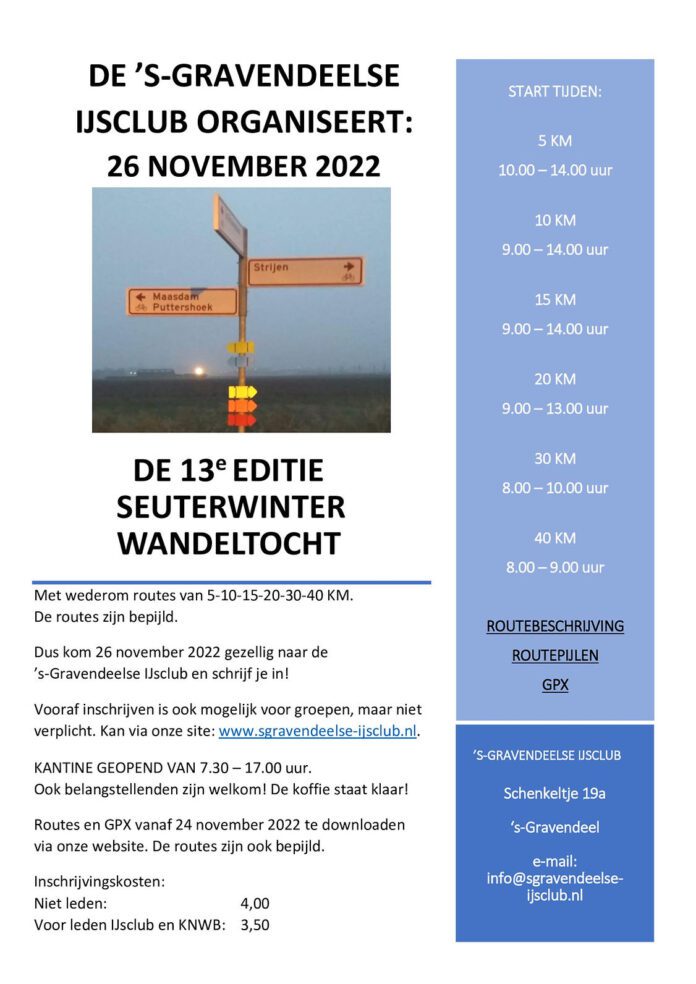 De ‘s-Gravendeelse IJsclub organiseert op zaterdag 26 november de 13e editie van de Seuter Winter Wandeltocht Met wederom routes van 5-10-15-20-30-40 KM. De routes zijn aangegeven met pijlen.
