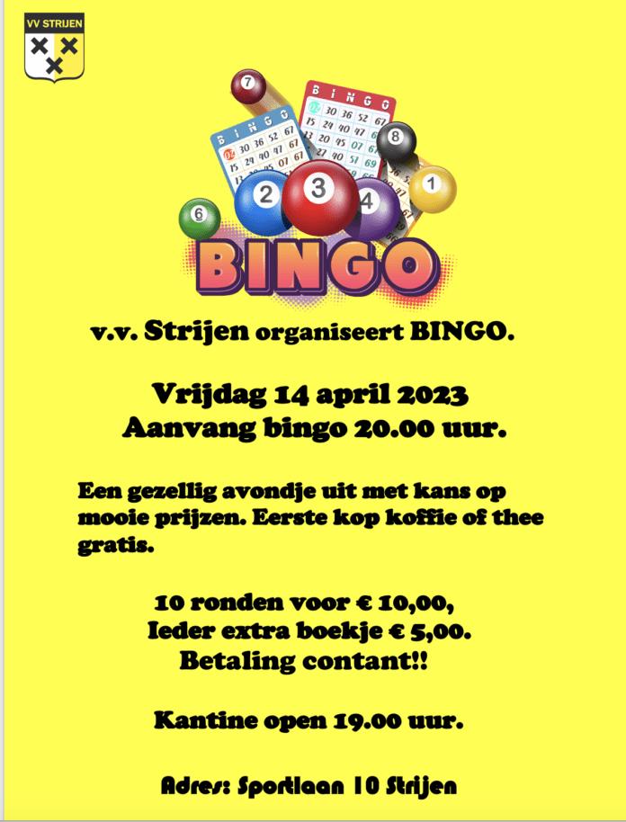 VV Strijen organiseert vrijdagavond 14 april weer een BINGO. Aanvang bingo 20.00 uur. Een gezellig avondje uit met kans op mooie prijzen. Eerste kop koffie of thee gratis.