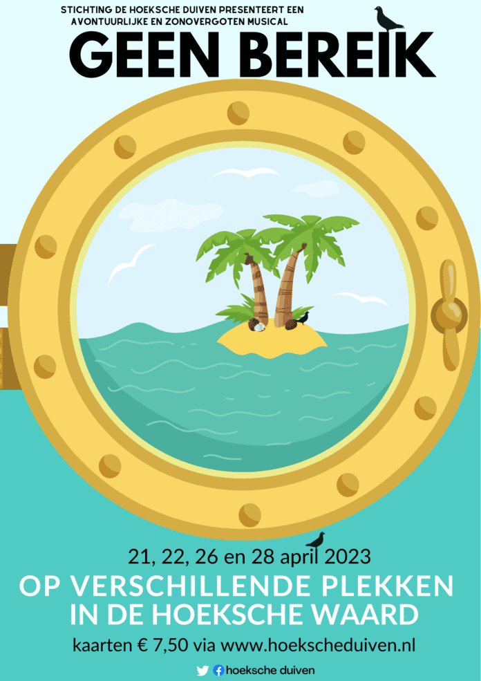 Musicalgezelschap De Hoeksche Duiven is eind april te zien met een spiksplinternieuwe musical. Het gezelschap staat dan op de planken met Geen Bereik, een avontuurlijke en zonovergoten musical van de hand van schrijfster Tineke van Zalinge. De regie is in handen van Rebecca van der Kolk en als zangcoach fungeert Marian Meeusen. Jan van Drunen verleent zijn muzikale medewerking aan de voorstelling.