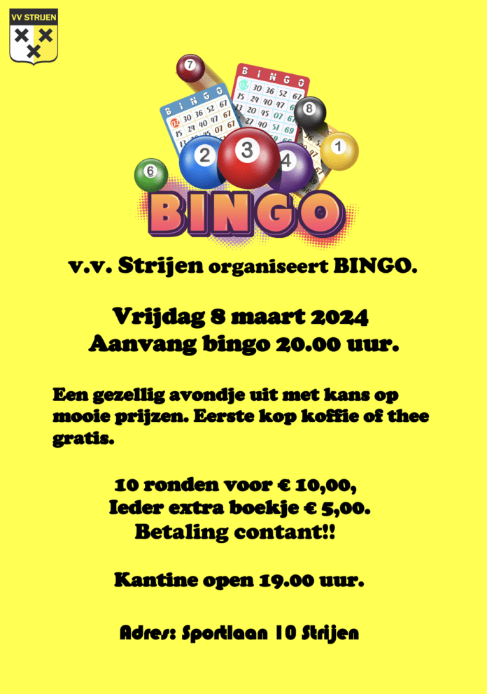 v.v. Strijen organiseert voor de bingo liefhebbers op vrijdagavond 8 maart weer een bingoavond! De aanvang van de bingo is om 20.00 uur. Een gezellig avondje uit met kans op mooie prijzen