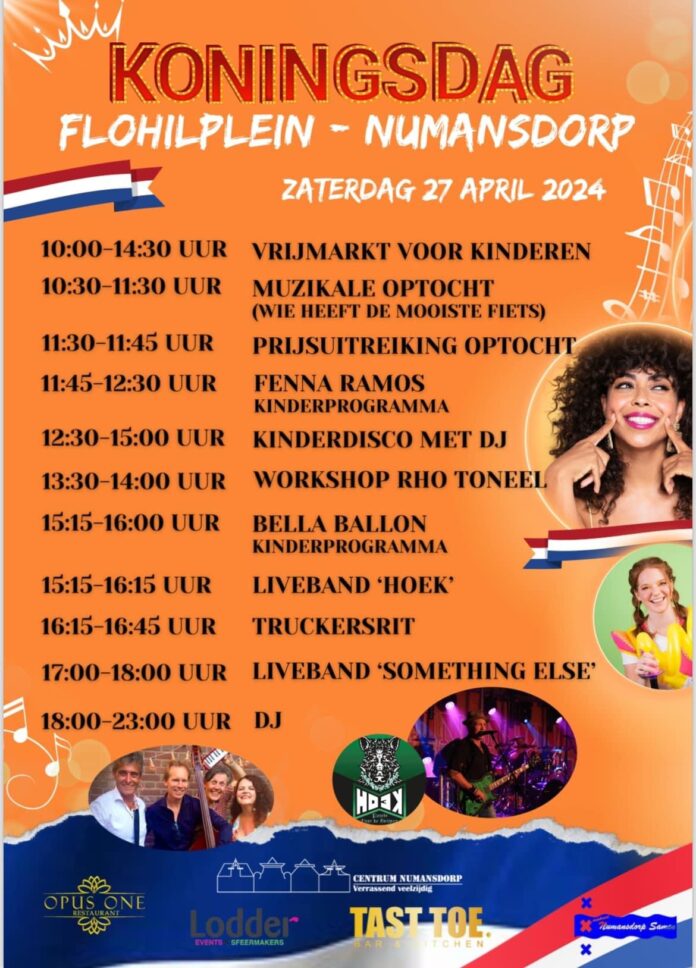 Er worden op Koningsdag in Numansdorp allemaal leuke activiteiten georganiseerd door Numansdorp Samen voor jong en oud: vrijmarkt, muzikale optocht en optredens van Fenna Ramos, kinder DJ, Rho Toneel en bands Hoek en Something Else.