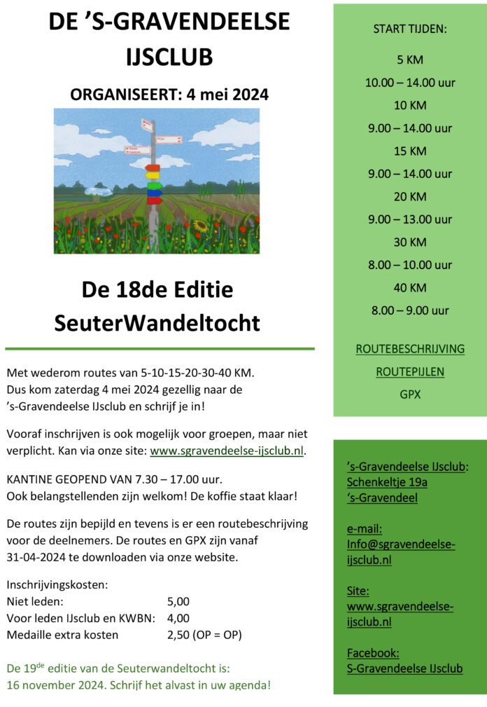 Op zaterdag 4 mei 2024 organiseert de ‘s-Gravendeelse IJsclub de 18de editie van de Seuterwandeltocht. Met afstanden van 5, 10, 15, 20, 30 en 40 km.